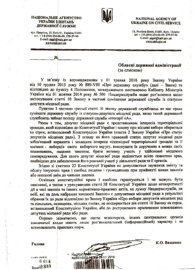 Він пояснює, що після вступу в дію з 1 травня закону про державну службу попросив офіційного роз'яснення у Національного агентства з питань держслужби.