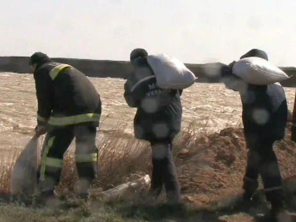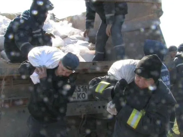 За допомогою самоскидів до вузьких ділянках дамби завезли більше 40 тон піску в мішках і стільки ж великого каміння.