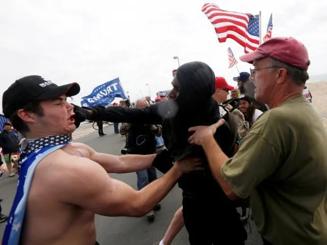 У Гантінґтон-Біч проводили мітинг на підтримку чинного президента під лозунгом "Зробимо Америку знову великою". На акцію прийшли дві тисячі активістів. Туди також завітали кілька десятків противників Трампа у чорних масках.