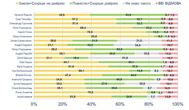 Мер Львова Андрій Садовий викликає повну або часткову довіру у 32,2% опитаних, 31% набрав комбат батальйону "Донбас" Семен Семенченко. Тоді як рейтинг довіри Юлії Тимошенко, за даними дослідження, 23,2%.