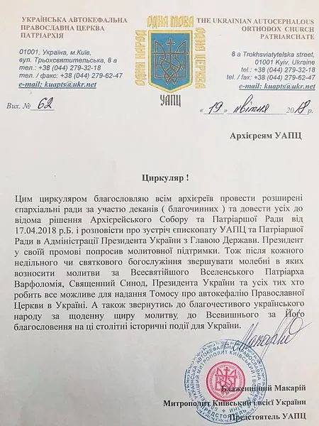 Циркуляр УАПЦ із проханням молитися за Порошенка