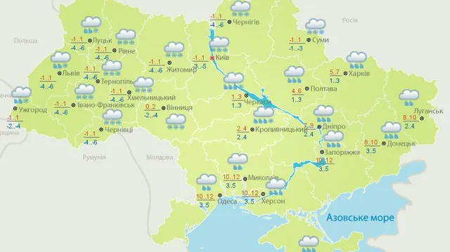 "Активний циклон зумовить складні погодні умови: у Київській, Житомирській, Чернігівській, Сумській, Вінницькій, Хмельницькій, Тернопільській, Івано-Франківській, Чернівецькій областях очікуються сильні снігопади та хуртовини, снігові замети, утворення снігового покриву висотою 15-25 сантиметрів, налипання мокрого снігу, на дорогах ожеледиця", – йдеться у повідомленні.