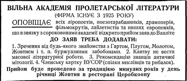 Можна сказати, що все почалось 1925 року, коли розпалилась перша літературна дискусія: такий собі партійний письменник тов. Яковенко обурився, що Хвильовий, керівник елітарної літорганізації ВАПЛІТЕ, та його однодумці оцінили якість текстів тов. Яковенка вельми низько. Мовляв, зверхні "олімпійці" зачинилися на своєму Олімпі й не пускають в літпроцес нові імена.