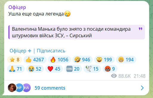 Дописи про це активно розповсюджували в месенджерах. Зокрема у Телеграм-каналі "Офіцер" старший лейтенант ЗСУ з позивним "Алекс" виступив на підтримку Манька, нагадавши, що той воює з 2014 року, а посаду начальника штурмових військ обіймає з осені 2025-го.