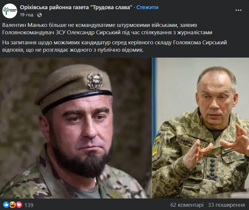 Звечора 9 лютого соцмережі вибухнули десятками повідомлень про нібито звільнення начальника штурмових військ, полковника Валентина Манька. Водночас він на своїй сторінці продовжував коментувати атаки 33 штурмового полку під Гуляйполем, а також обіцяв звільнити селище від російських окупантів.