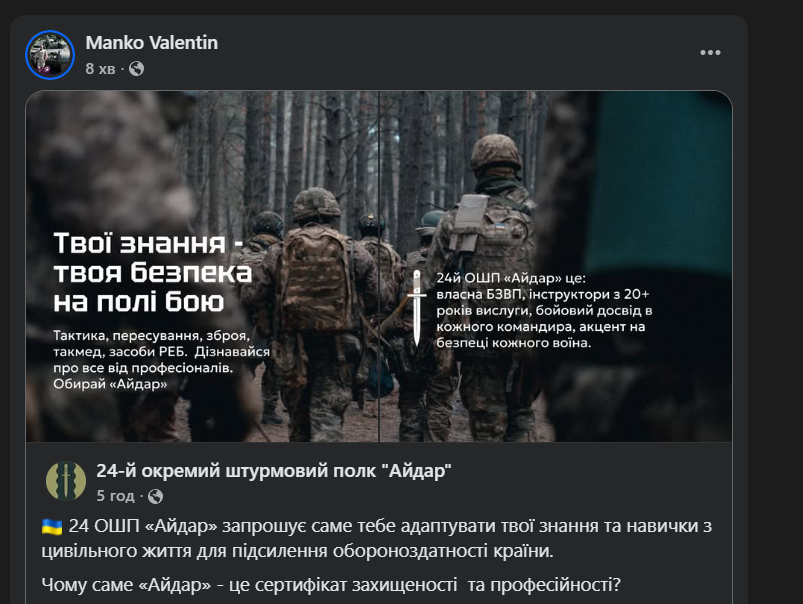 На Facebook-сторінці самого полковника Манька про звільнення також нічого немає. 8 лютого він повідомив, що перехворів, але вже отримав ліки й повертається на фронт. Крім того, є репости про успіхи 33-го штурмового полку та кадри тренувань 210-го окремого штурмового полку з наголосом на важливість підготовки й досвіду. А нещодавній допис, поширений Маньком вдень 10 лютого, розповідає про полк "Айдар", при цьому знову ж таки не роблячи жодних натяків на можливу відставку.