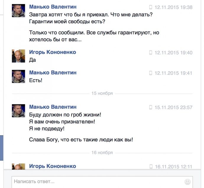 Голова політради УКРОПа Андрій Денисенко у грудні 2015 року оприлюднив листування нібито Валентина Манька з першим заступником голови "Блоку Петра Порошенка" Ігорем Кононенком. У листуванні нібито доводить, що справу полковника закрили саме за свідчення проти Корбана.