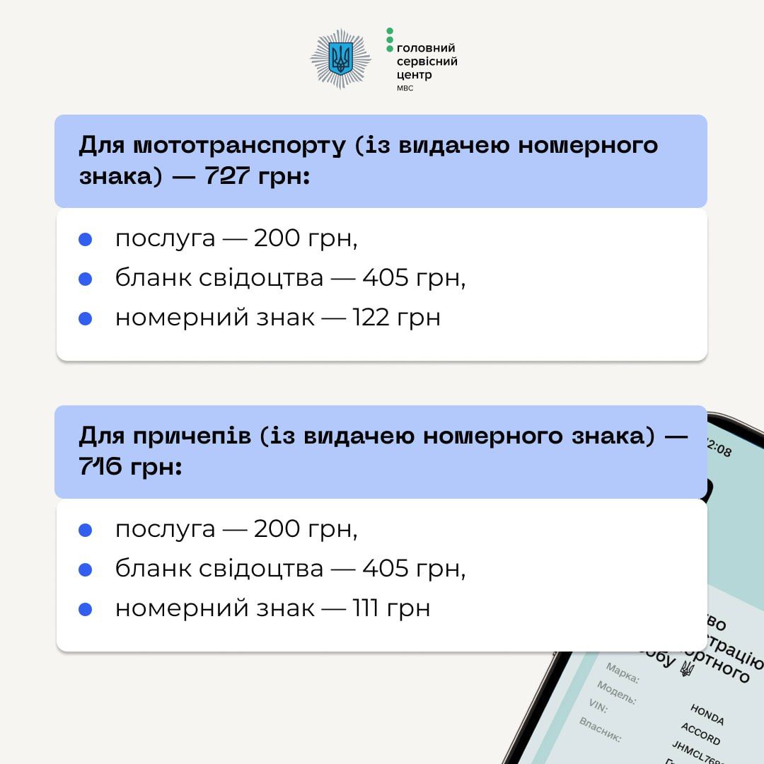 - для мототранспорту (із видачею номерного знака) – 727 гривень: