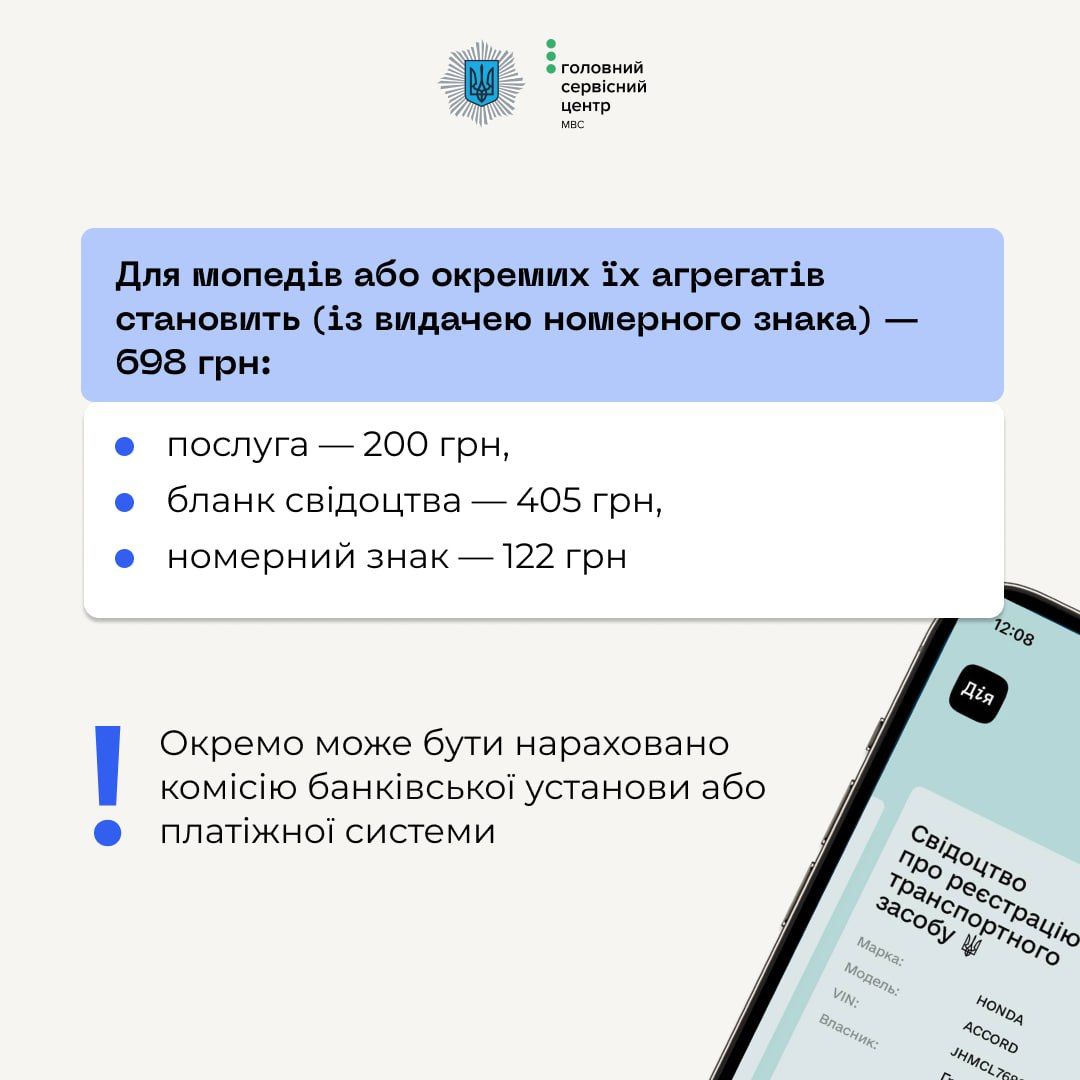 - для мопедів або окремих їх агрегатів становить (із видачею номерного знака) – 698 гривень:
