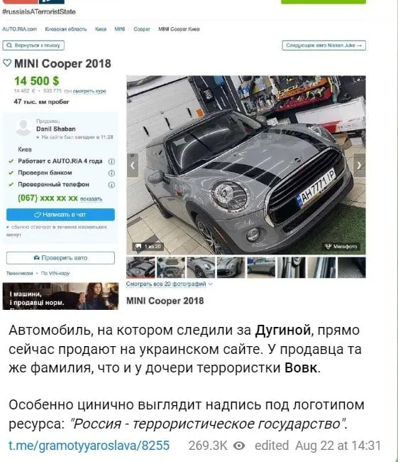 Крім того, у російських ЗМІ повідомили, що дівчини є Toyota Corolla. Проте сайті з продажу автомобілів оперативно знайшовся чомусь той самий MINI Cooper, на якому вона нібито в’їхала в росію. Продавав машину нібито українець Данило Шабан, який також служить у полку "Азов".