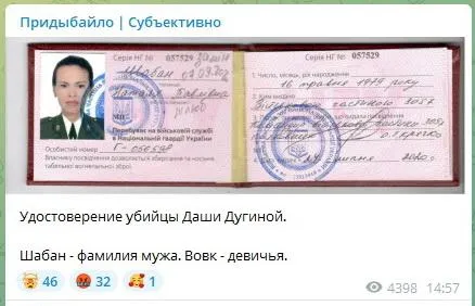 Після публікації оголошення про машину пропагандист костянтин придибайло виклав в телеграмі фото службового посвідчення Наталії Шабан. Він каже, мовляв, Шабан – це дівоче прізвище Наталії Вовк.