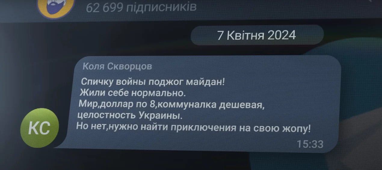 Журналістам вдалося знайти відео за листопад 2022 року, на якому Михайло Сцельніков розмовляв із російським блогером. Під час розмови пропагандист звинуватив Україну в ударі по вокзалу в Краматорську у квітні 2022 року, під час якого загинула 61 людина. Сцельніков погодився з росіянином.