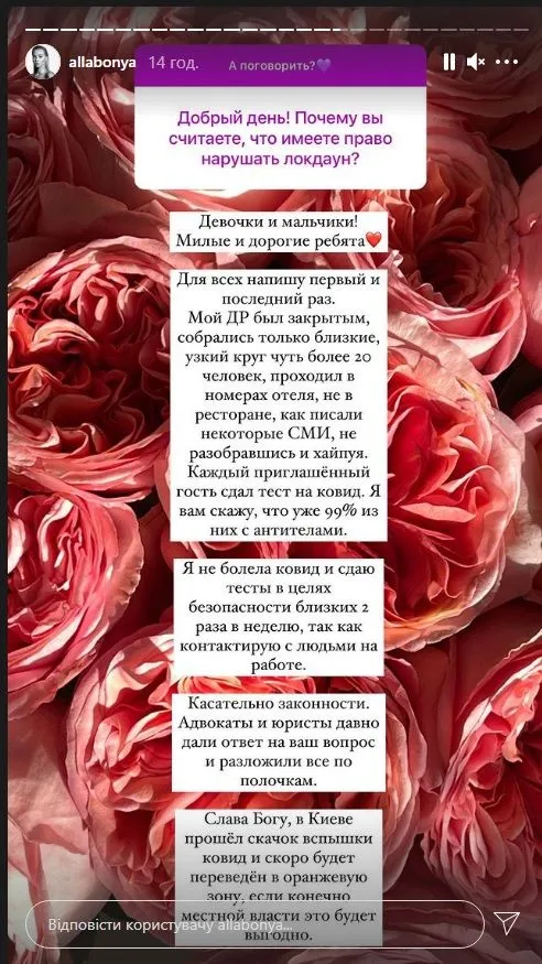 Модель висловила жаль, що вечірка когось образила / Скриншот з інстаграму Алли Барановськ