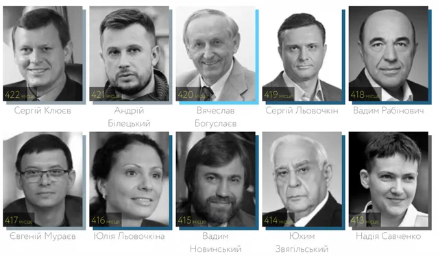 Серед лідерів рейтингу переважно депутати "Блоку Петра Порошенка" і "Народного фронту". І це теж легко пояснити – без голосів коаліції закони не можуть прийматися. Тому навіть якщо опозиціонери подають реформаторські закони, але згоди коаліції не має – це провал. Серед аутсайдерів же рейтингу прізвища добре відомі. Останню, 422 сходинку, посідає втіклий депутат Сергій Клюєв. Йому вже точно не до Ради і реформ.