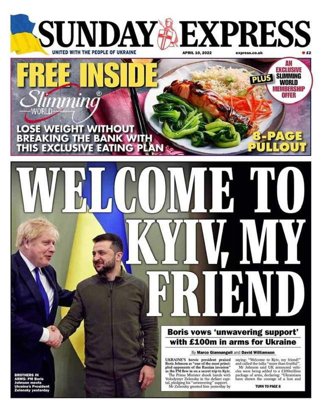 Тим часом усі британські газети буквально рясніють світлинами з візиту Джонсона до Києва.