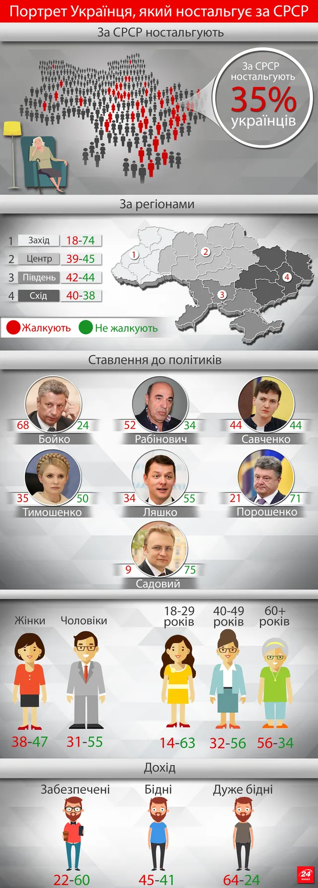 Серед політичних симпатій тих, хто жалкує за Союзом – лідер Опозиційного блоку Юрій Бойко та Вадим Рабінович, а прихильники Надії Савченко поділились порівну – по 44% тих, хто відчуває ностальгію за СРСР та тих, хто не жалкує за розпадом країни, яка займала 1/6 частину суші.