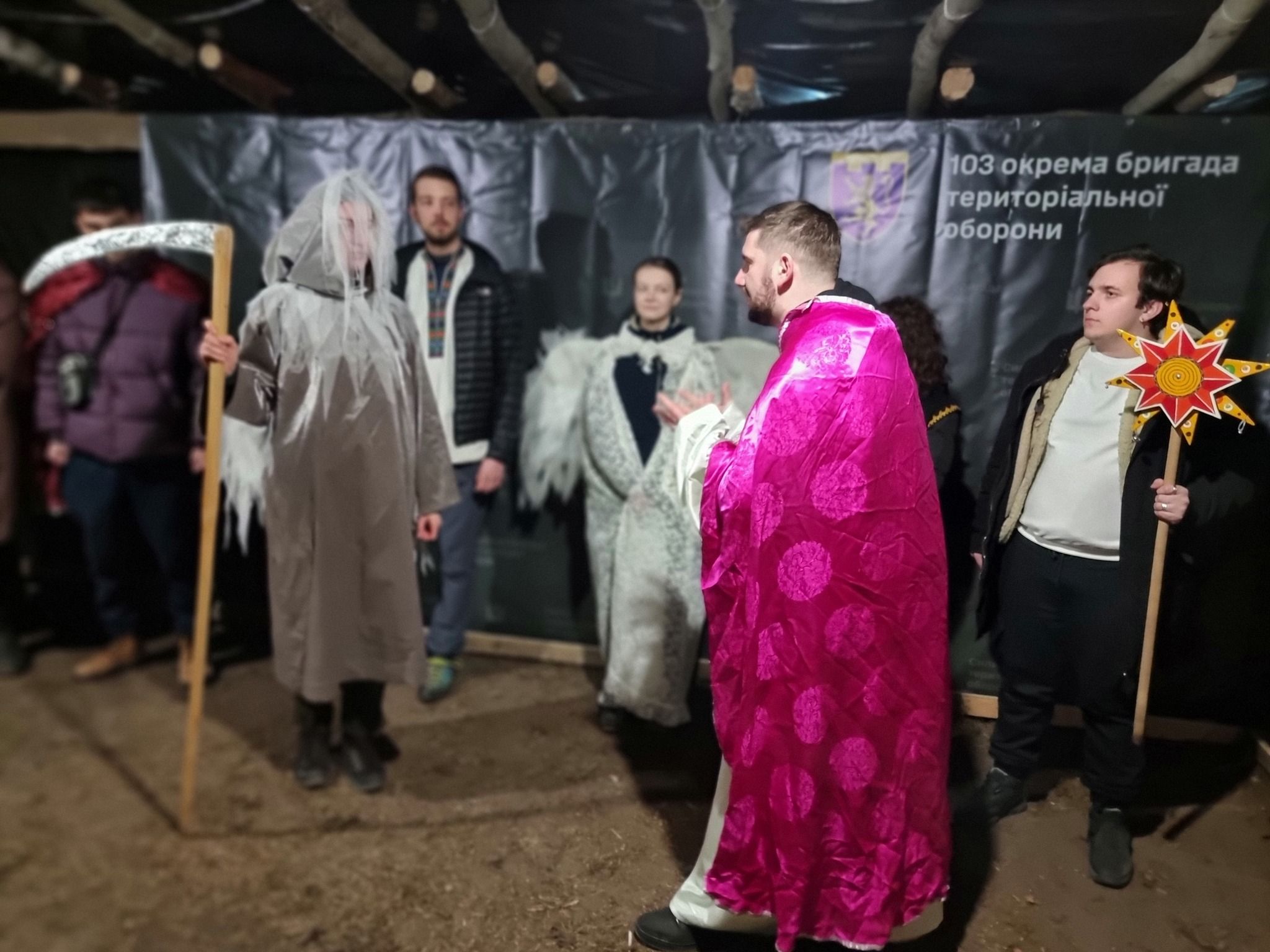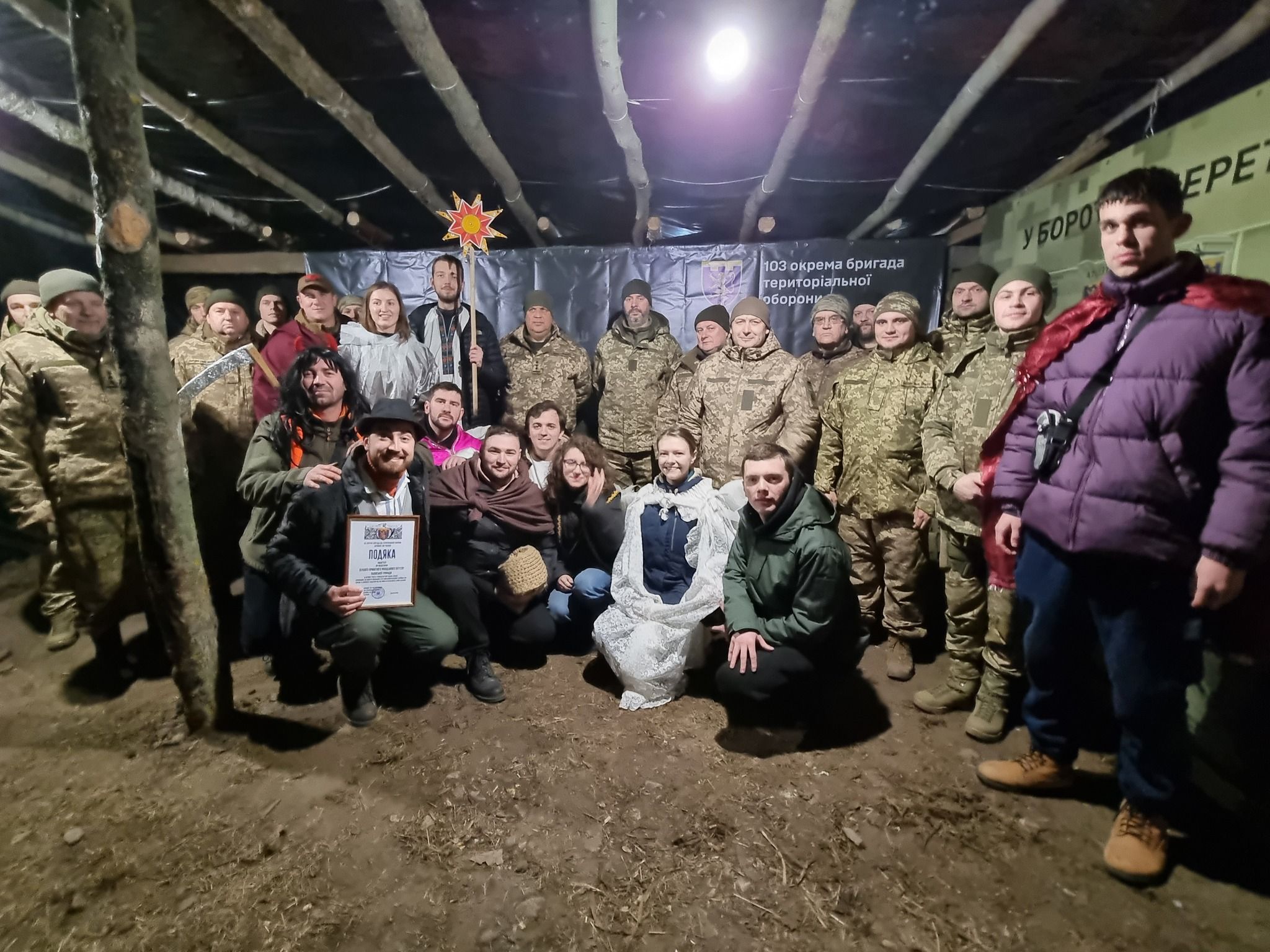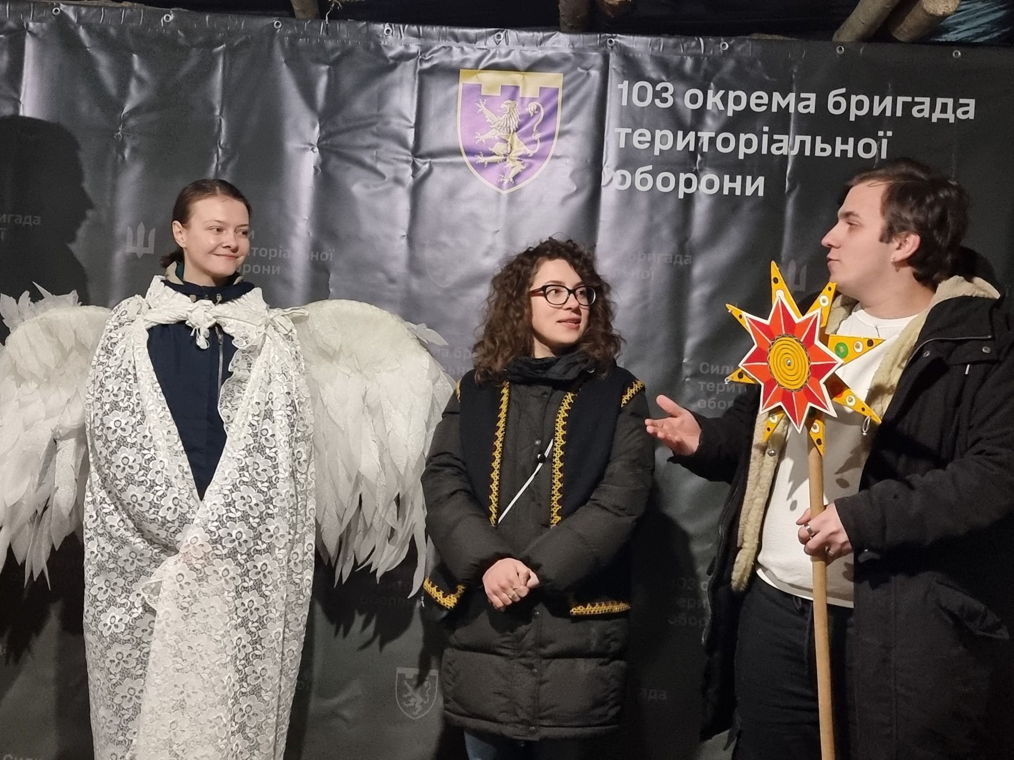 Таким шляхом ми приїхали до фактично останньої точки, де мали заколядувати – до 103-ї бригади Тероборони. Уперше ми мали честь колядувати безпосередньо для командира бригади. Військові пильно спостерігали за виступом вертепу, а звуки пострілів нас уже ніяк не лякали й не дивували.