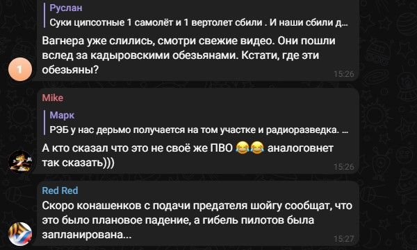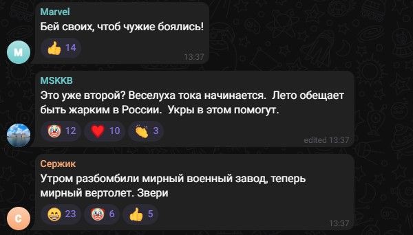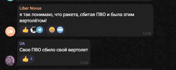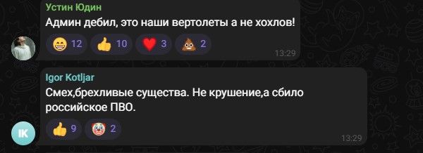 У мережі ширилися інформація, що збили буцімто ракету, але на опублікованих кадрах чітко видно, що то вертоліт. Деяким росіянам, вочевидь, набридло, що їх тримають за дурнів, а тому почали лаятися. Російську владу почали звинувачувати у брехні, а військових – у "дружньому вогні".