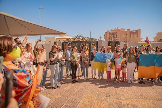 Декілька десятків людей з українськими стягами зібрались на площі та виконали наш державний славень. Відповідне оголошення з закликом оприлюднили на сторінці у фейсбук посольства України в Катарі.