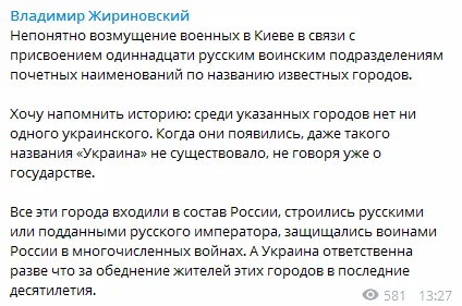 "Хочу нагадати історію: серед зазначених міст немає жодного українського. Коли вони з'явилися, навіть такої назви "Україна" не існувало, не кажучи вже про державу. Всі ці міста входили до складу Росії, будувалися росіянами або підданими російського імператора, захищалися воїнами Росії в численних війнах. А Україна відповідальна хіба що за зубожіння жителів цих міст в останні десятиліття", – цинічно заявив Жиріновський.