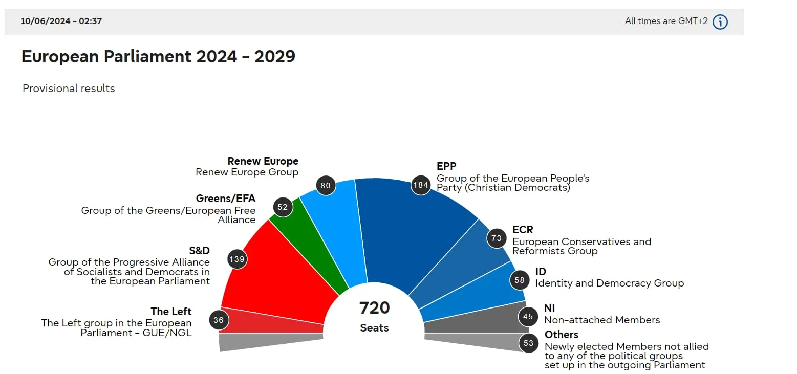 Очікується, що EPP, "Оновити Європу" та соціал-демократи (S&D) матимуть 403 мандати, що створює сприятливу ситуацію для Урсули фон дер Ляєн, яка потребує підтримки 361 депутата для другого терміну на посаді президента Єврокомісії.