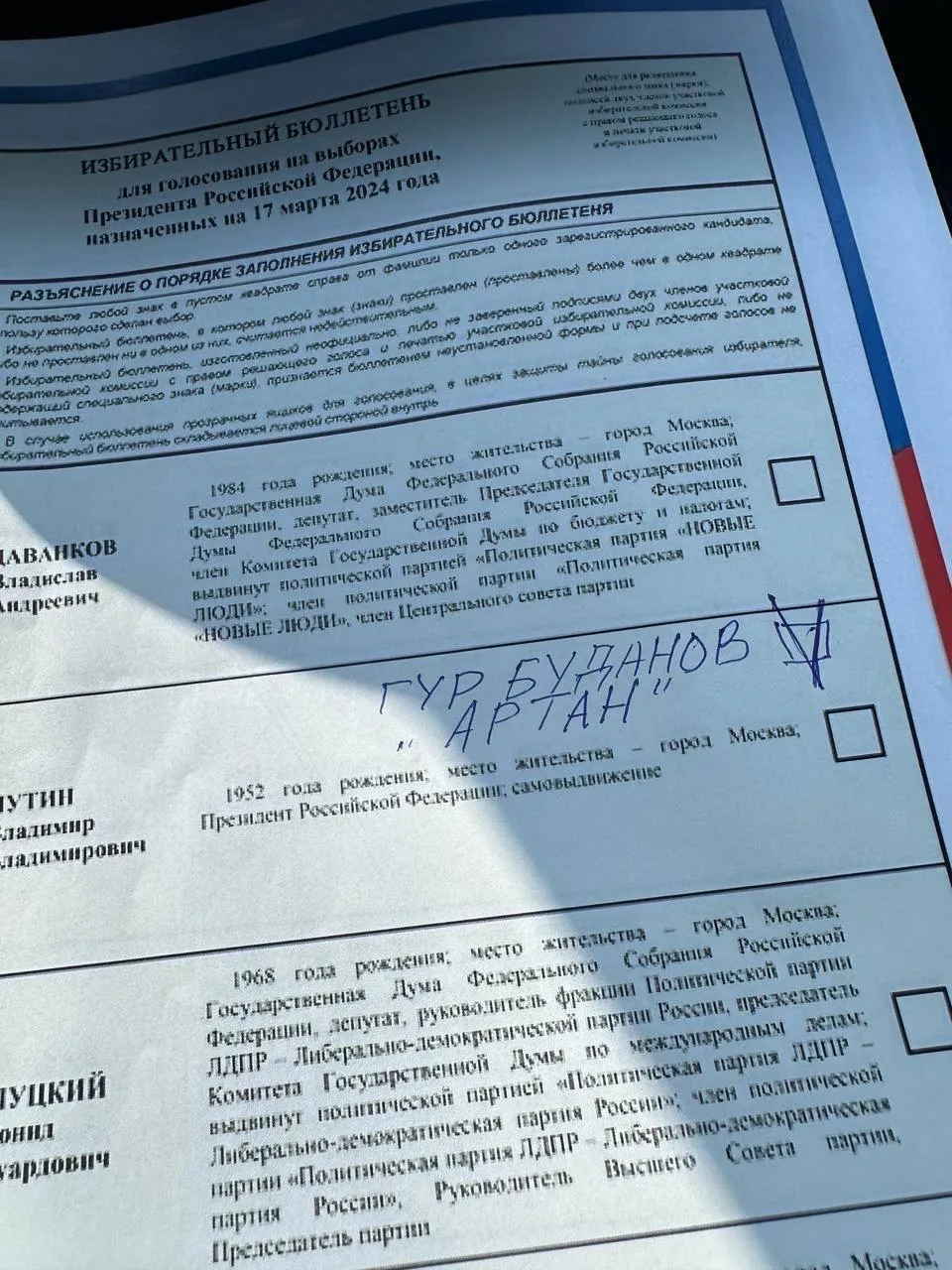 Джерела 24 Каналу поділилися ексклюзивним фото з виборчої кабінки у Росії під час проведення голосування за президента. Так, поряд з кандидатами на пост очільника Росії, посаду, якого очевидно знову займе Владімір Путін, з'явилося прізвище головного розвідника України. Свою "галочку" на цьому бюлетені поставили за Кирила Буданова.