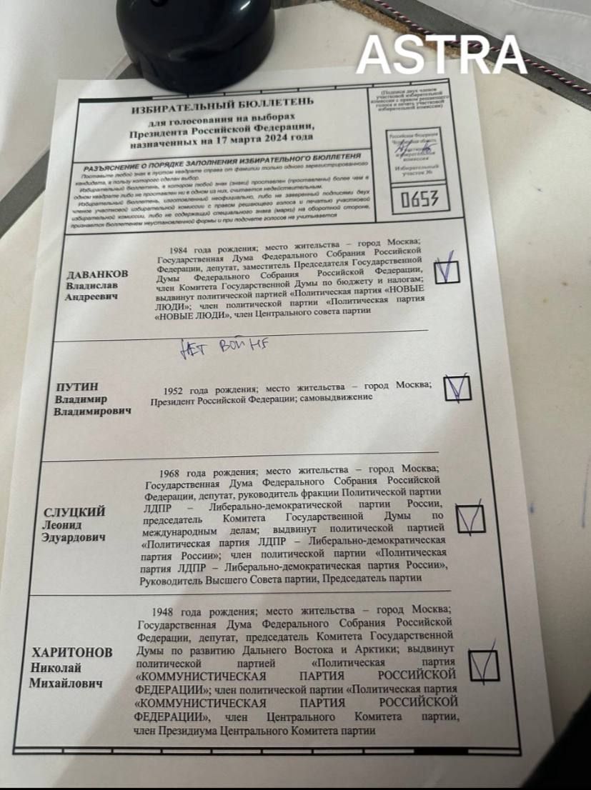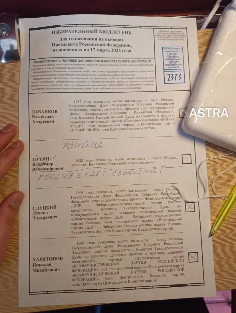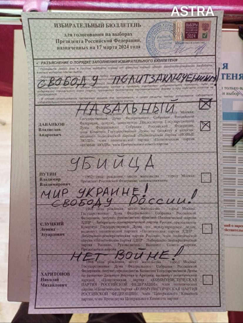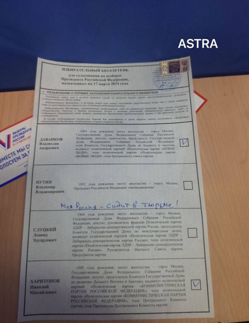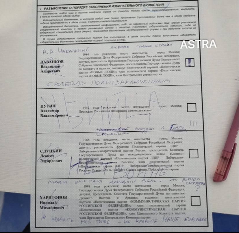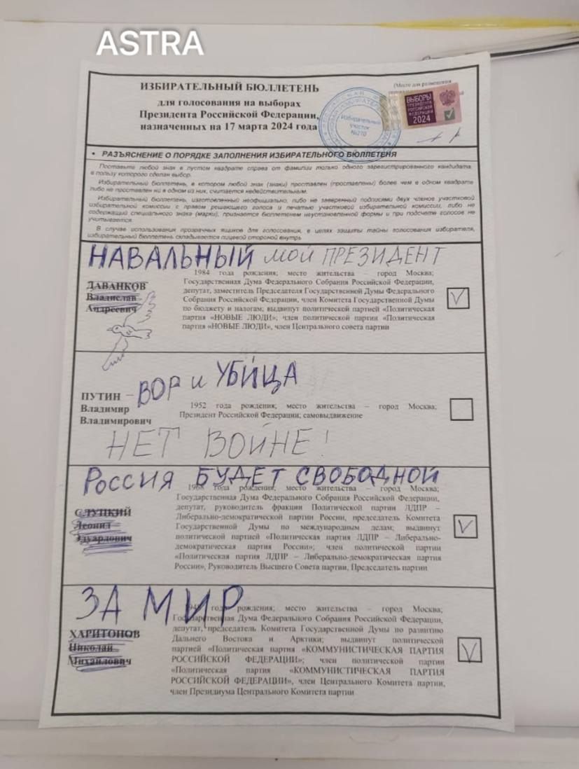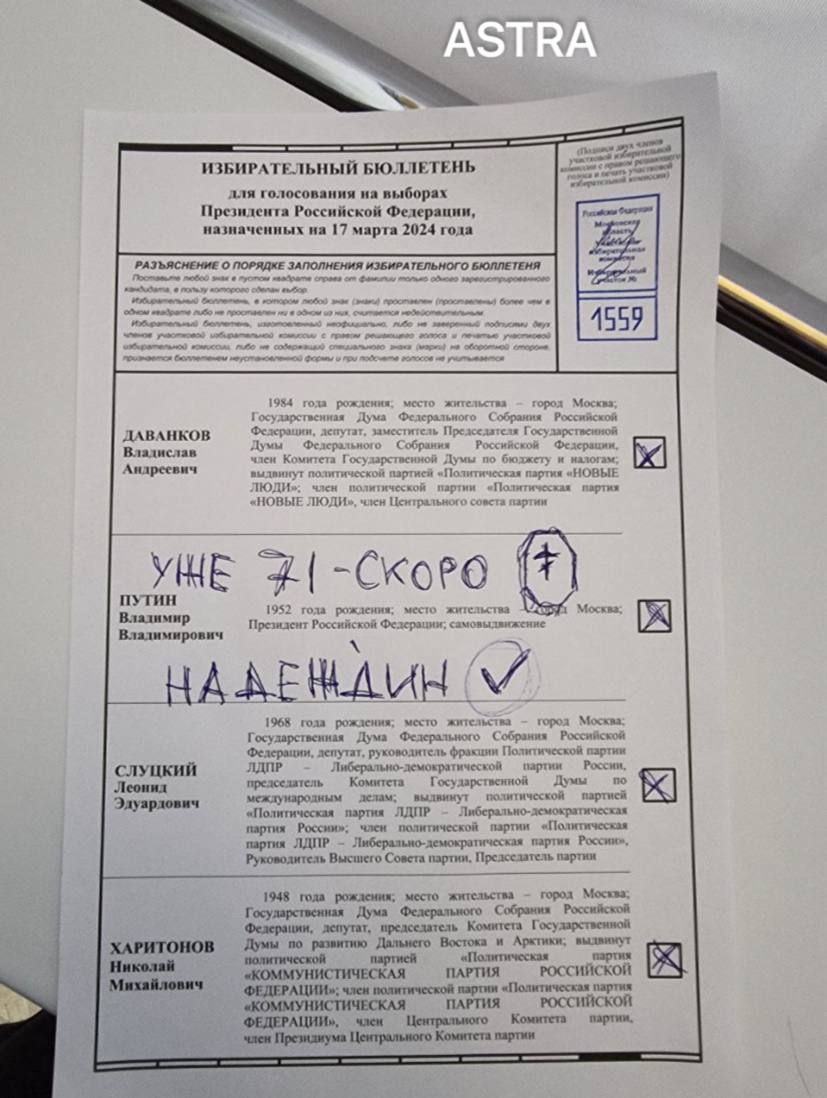 Також окремі виборчі поверх вказаних у бюлетенях прізвищ пишуть власних кандидатів – зокрема, вказують, що їх вибір це Олексій Навальний або Борис Надєждін. Напроти прізвища Владіміра Путіна вони пишуть, що той вбивця, злочинець та психопат. Також пригадують вік президента Росії – тому вже 71 рік, тому окремі виборці впевнені, щоб скоро настане "кінець".