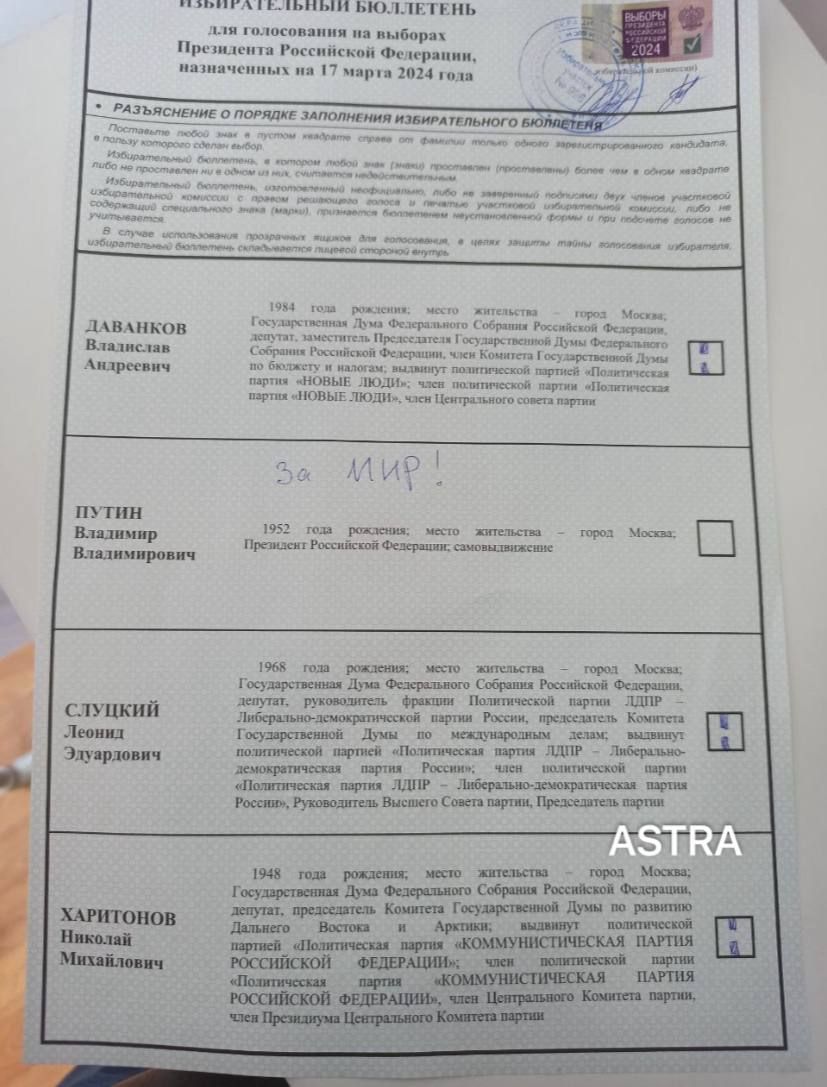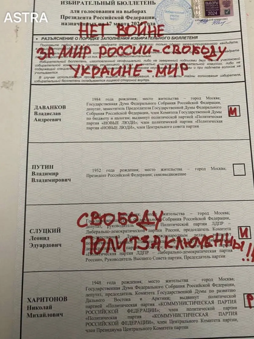 Зокрема, деякі росіяни писали на листі "ні війні", а також "Росії – свободу" або відкрито висловлювалися за мир в Україні. Окрім цього, виборці писали заклики до звільнення політв'язнів у Росії та зазначали, що "мир Росії сидить у в'язниці".