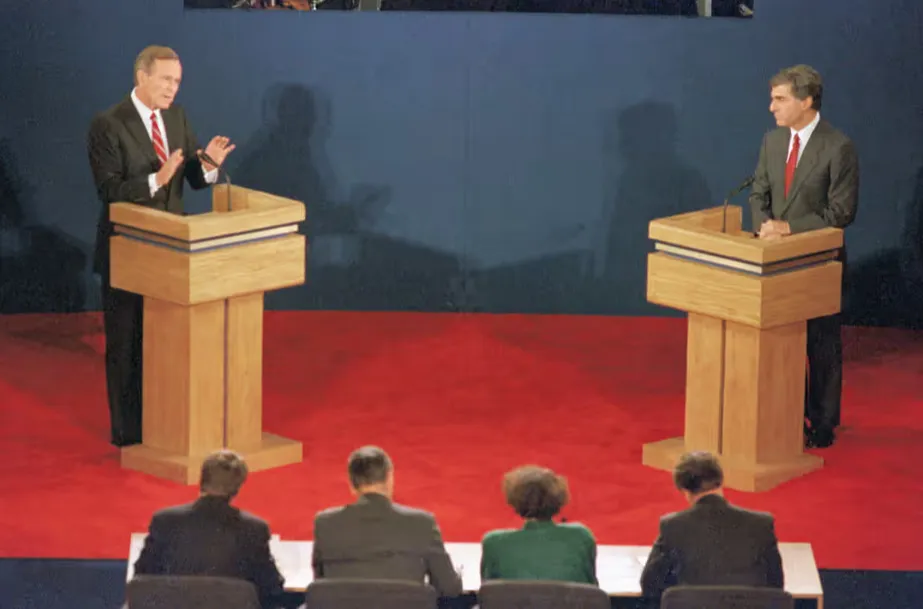 Джордж Буш-старший і Майкл Дукакіс дискутують у Вінстон-Сейлемі, штат Північна Кароліна, у 1988 році / архів Bettmann