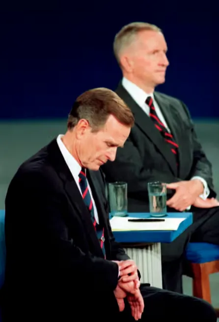 У тристоронній боротьбі з демократом Біллом Клінтоном і бізнесменом Россом Перо президент Джордж Буш-старший зробив фатальну помилку, подивившись на годинник.