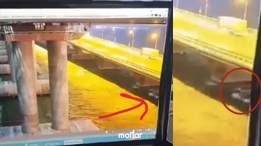 На кадрах з камери, прикріпленої до залізничної частини мосту, можна побачити, як між опорами видно білий об'єкт – він рухається водою. Однак, чи це хвиля, чи якийсь човен – сказати важко, адже в перші секунди камеру осліплює вибух.