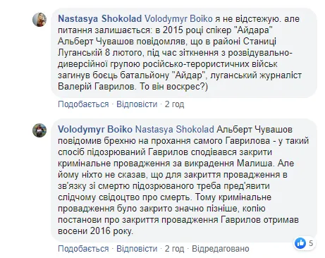 За словами Бойка, Гаврилова вважали мертвим з лютого 2015 року. Мовляв, спікер "Айдару" Альберт Чувашов заявив про загибель бійця у бою з окупантами на Донбасі. Та таку заяву Чувашов зробив на прохання самого Гаврилова, який таким чином інсценуючи свою смерть намагався закрити кримінальне провадження щодо себе (за викрадення Малиша).