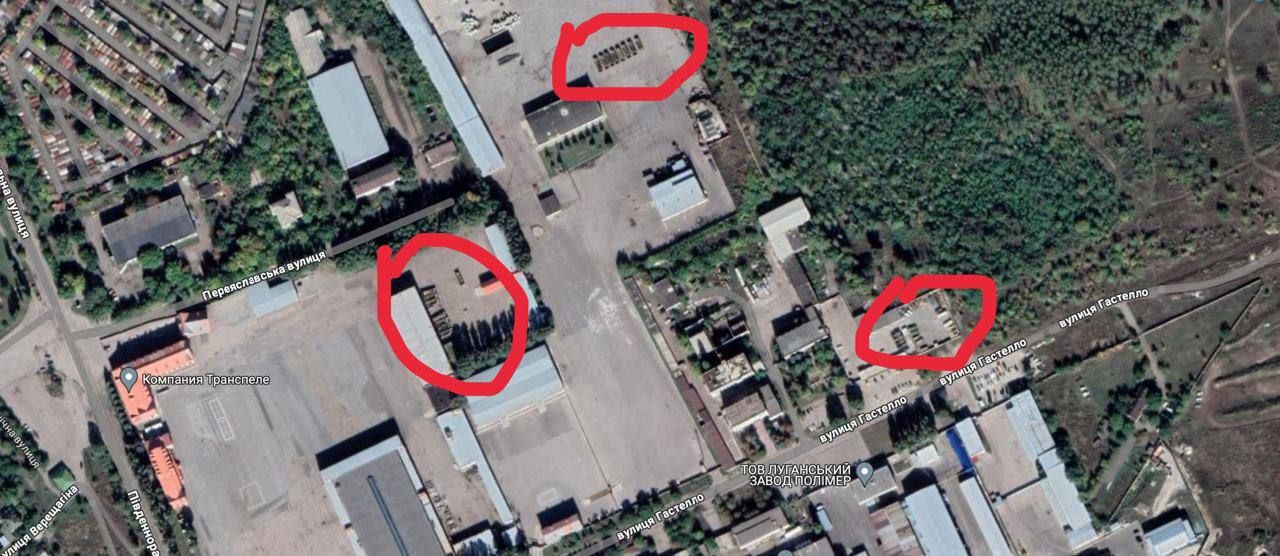 Супутникові знімки військової бази у Луганську, куди потрапили ракети. На них видно російську військову техніку. Усередині було багато особового складу,
