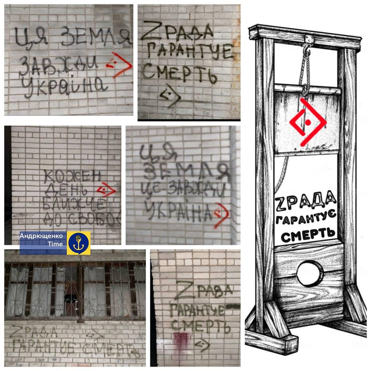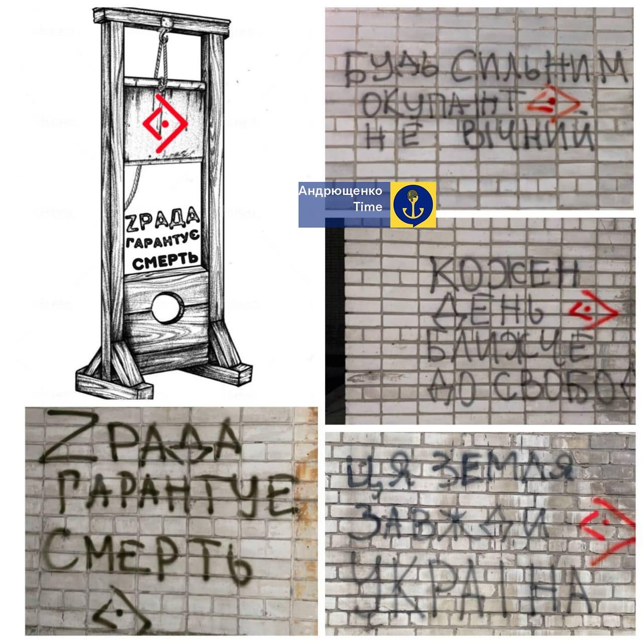Проте цікава навіть не "бавовна", а велика кількість погрозливих надписів, які почали з'являтися у місцях проживання колаборантів, – мера, його заступників та депутатів. Українські партизани нагадали зрадникам, що відплата неминуча.