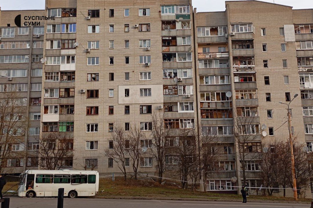 Уранці (22 листопада – 24 Канал) війська Росії атакували Суми трьома дронами-камікадзе. Пошкоджені 12 багатоповерхових та 5 приватних житлових будинків, магазин та 3 автомобілі,