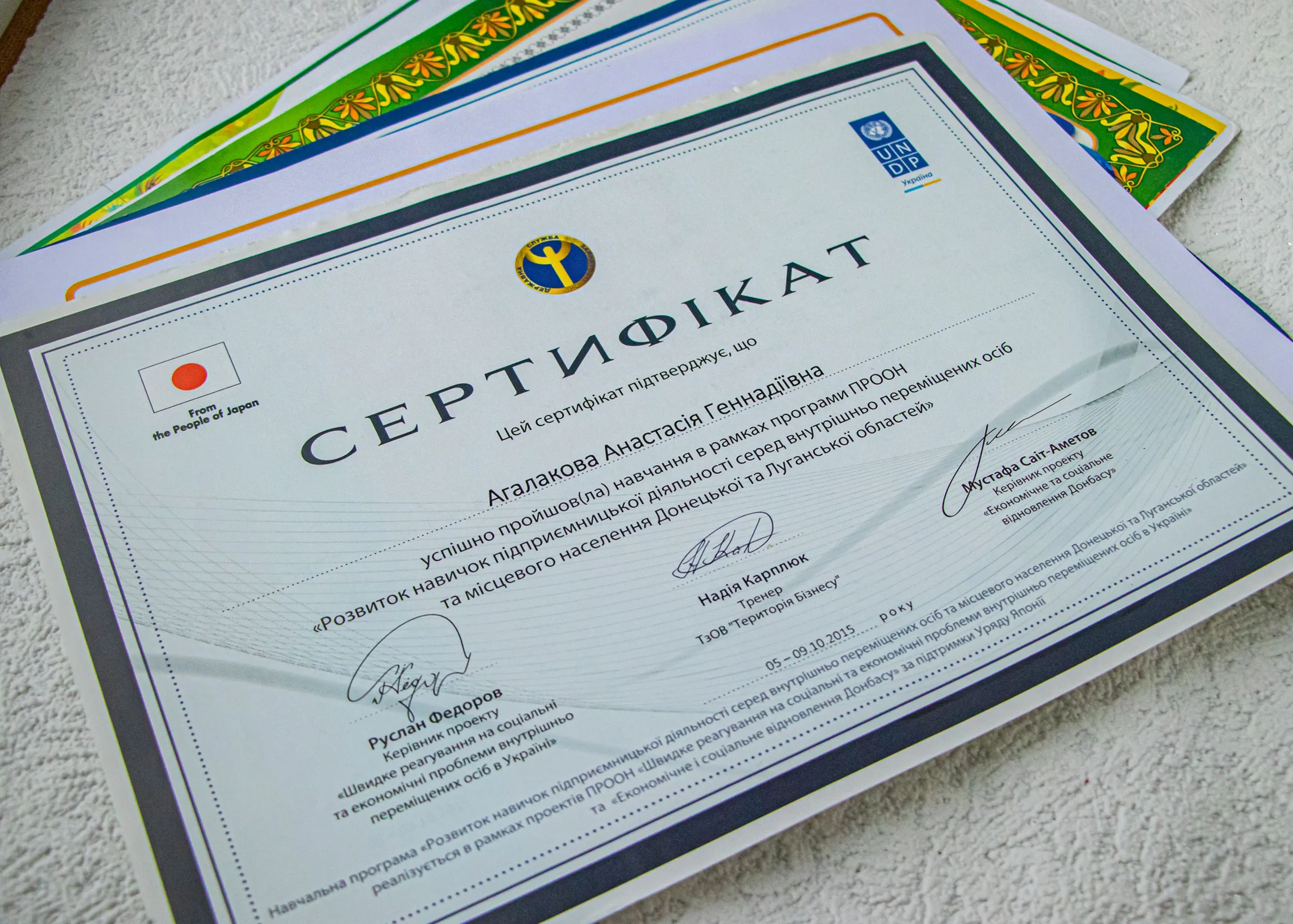 Анастасія показує безліч сертифікатів про проходження курсів та тренінгів з ведення бізнесу