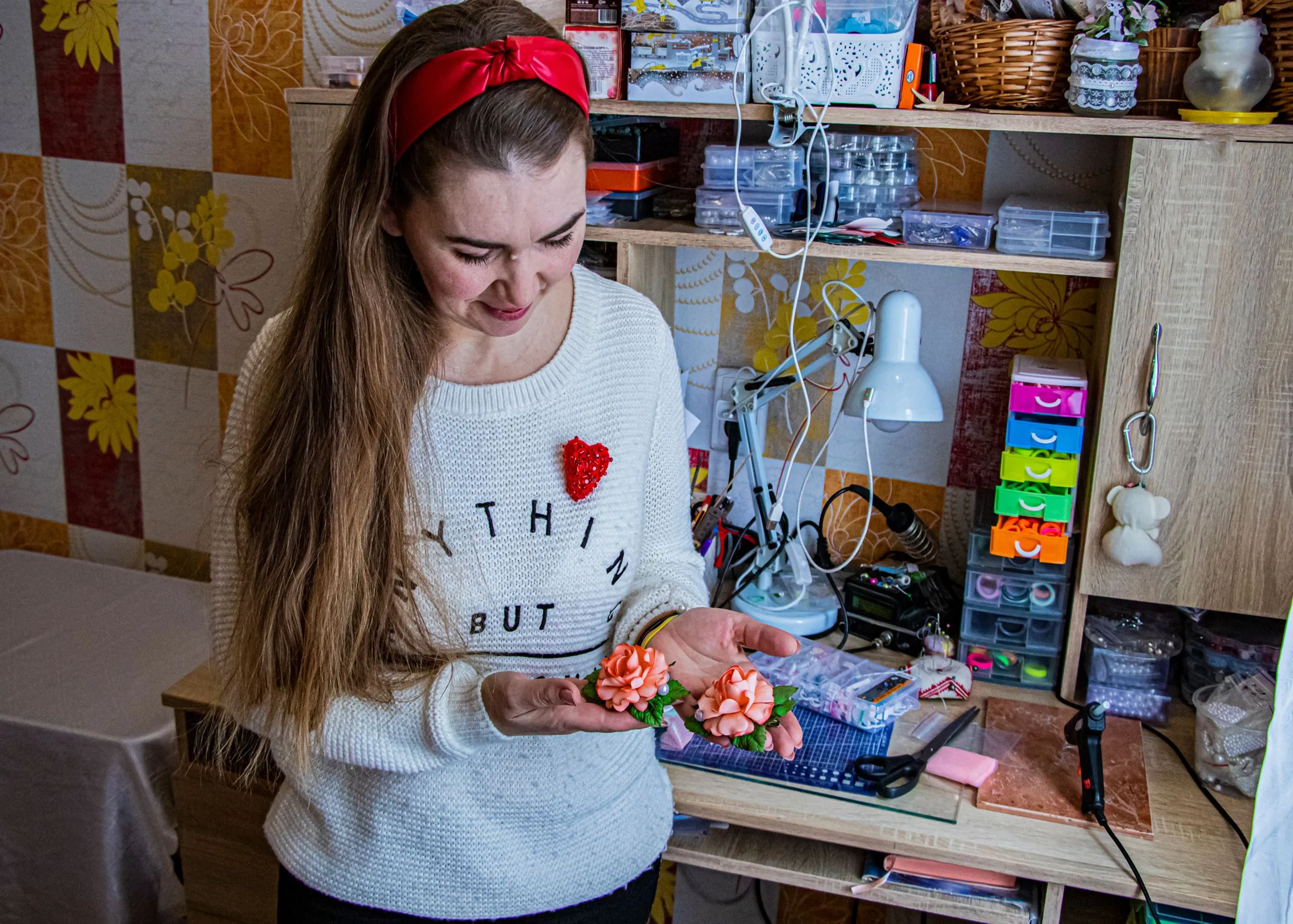 Анастасія демонструє заколки (обруч і брошка-серце – теж її вироби)