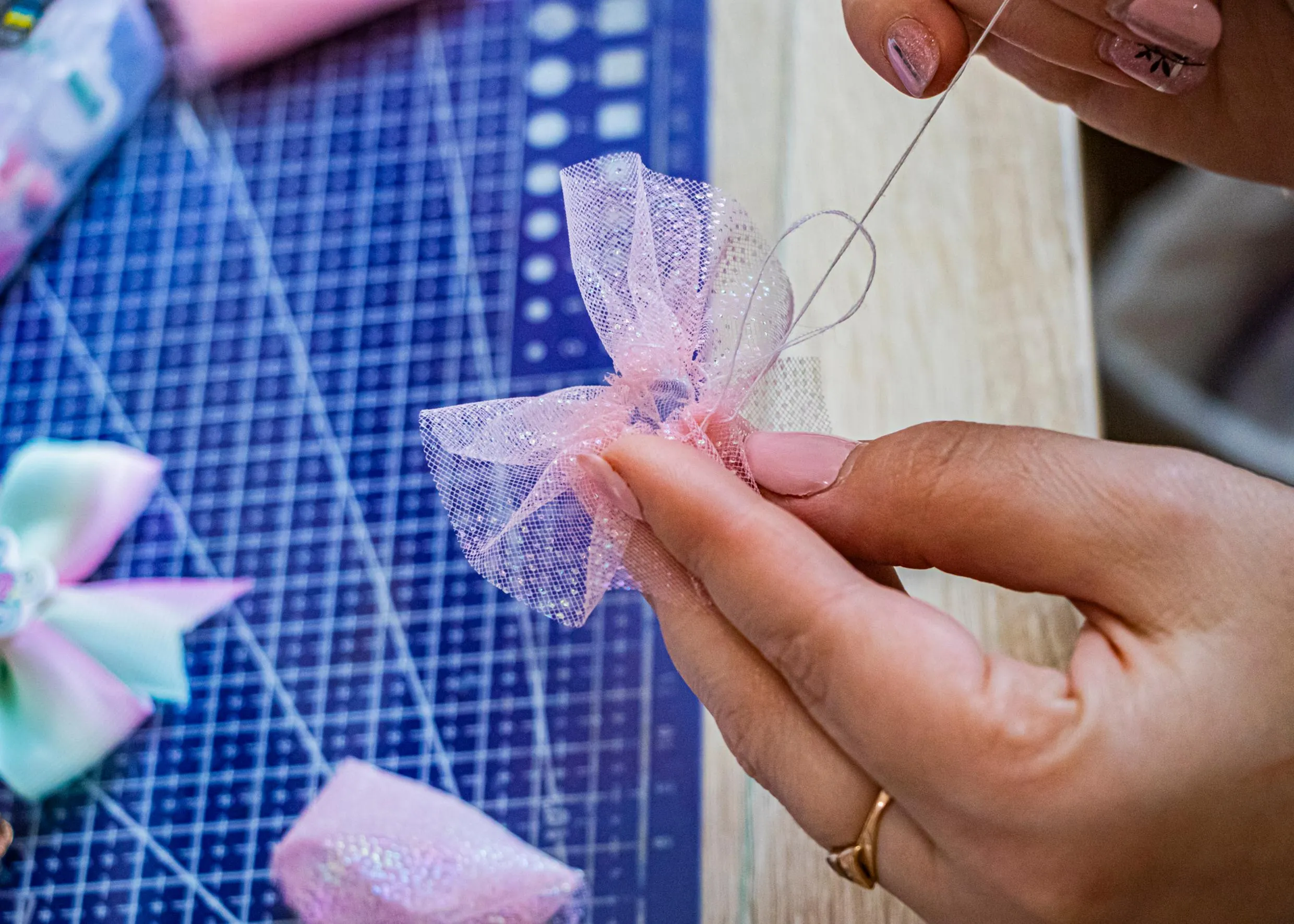 Анастасія шиє бантик для майбутньої прикраси