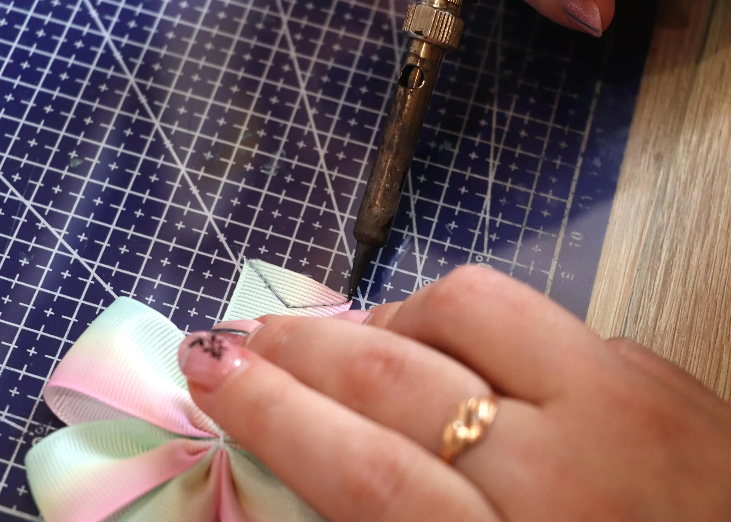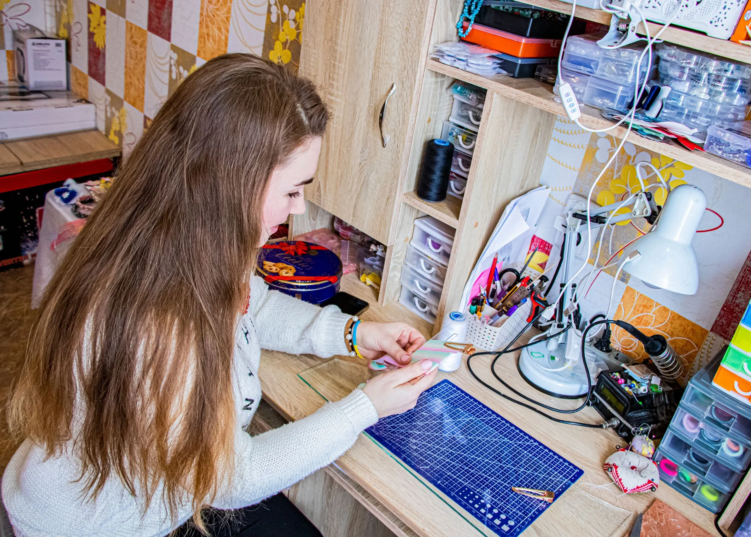 Рідні дуже підтримують і це не може не надихати. Чоловік мені всякі пристосування робить для того, щоб все було швидше і простіше. Наприклад, сконструював паяльник з регульованою температурою. Щоб стрічки не обрізати спочатку ножицями й потім край підпалювати запальничкою, а прямо паяльником відрізати – набагато зручніше. А якщо температуру зменшити, то можна, наприклад, на листках тканинних робити прожилки.