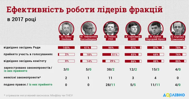 Відповідно до даних рейтингу, найкраще попрацювали лідери "Блоку Петра Порошенка", "Народного фронту та "Об'єднання "Самопоміч".