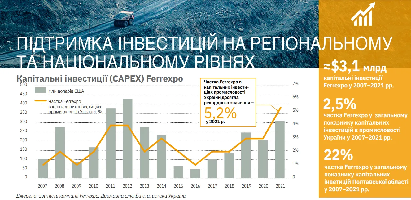 Частка компанії у капітальних інвестиціях промисловості України досягла 5,2% у 2021 році / Інфографіка Ferrexpo