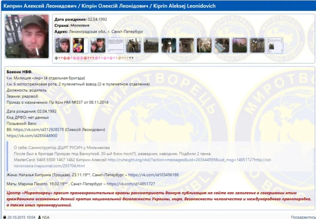"Експрес-осінт покидька, який знімав відоме всім відео з нашими полоненими. Кіпрін Олексій Леонідович 02.04.1992. ІПН 780726406586. Домашня адреса Санкт-Петербург, вул. Тамбасова буд.24 к.1 лит.1 кв.59. Нацист, язичник, воював разом із садистом Мільчаковим у складі ДШРГ "Русич", – йдеться в повідомленні.