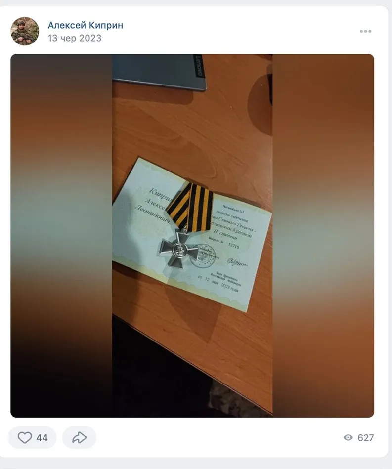Рік тому Алєксєй ділився у соцмережах фотографіями своєї нагороди “георгіївський хрест” за підписом Владіміра Путіна.