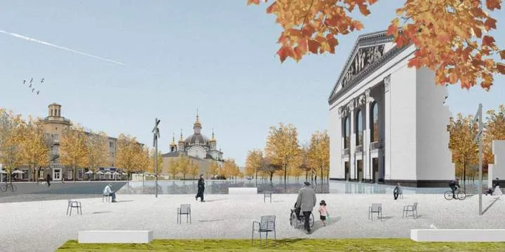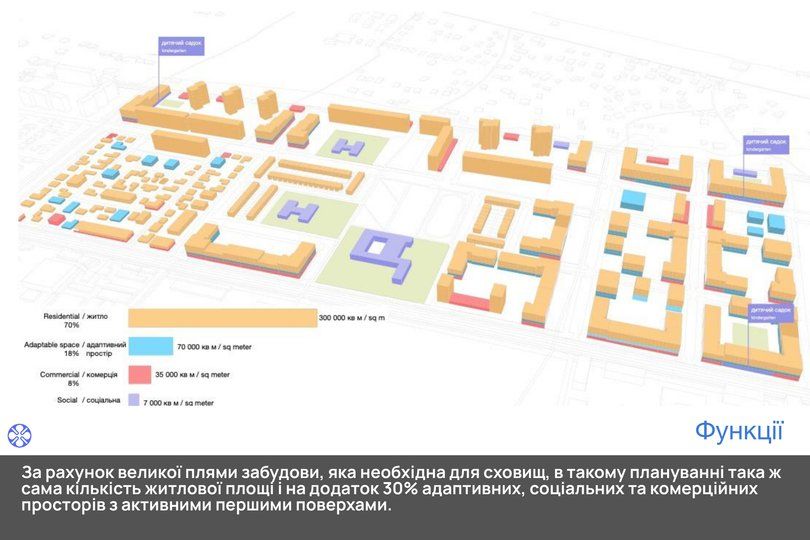 На запропонованій візуалізації урбаніст показує, що частину старих будівель можна відреставрувати, але водночас, перебудовуючи місто, можна додати зручностей: паркінги під землею, які також будуть слугувати укриттями, парки та багато зелених насаджень, комфортні будинки – все, що має створювати гарне поєднання особистих і колективних просторів у районі.