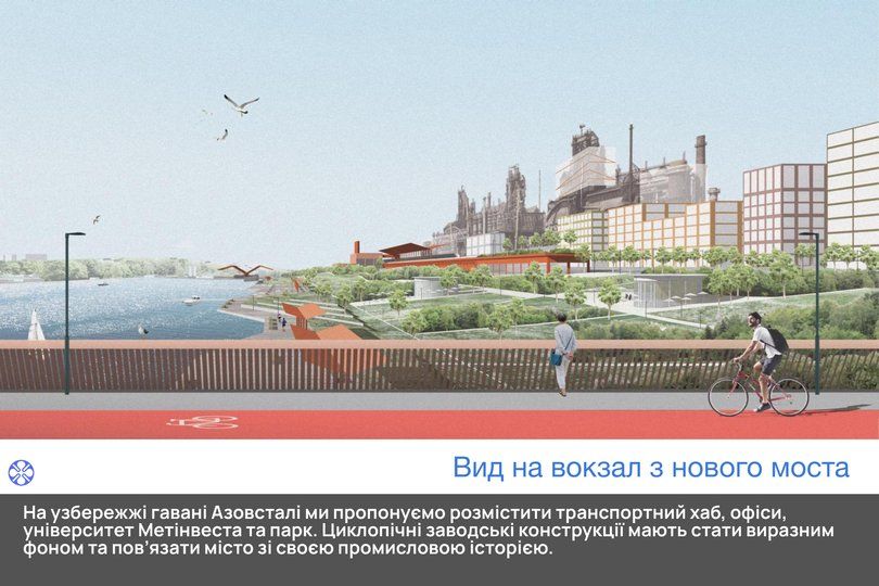 Урбаністи, які працюють над повоєнною стратегією відродження Маріуполя, намагаються поєднати елементи екології і економіки для того, щоб оптимально забезпечити місто робочими місцями, житлом і дати безпеку. Пропонується створення центрального транспортного хабу на площі біля головних прохідних воріт "Азовсталі". Він поєднає залізничний вокзал та автовокзали, трамвай, автобуси, водне таксі та пором в Керч. Згодом ця територія може використовуватись і для житла. На узбережжі гавані "Азовсталі" рекомендують розмістити також офіси та парк.