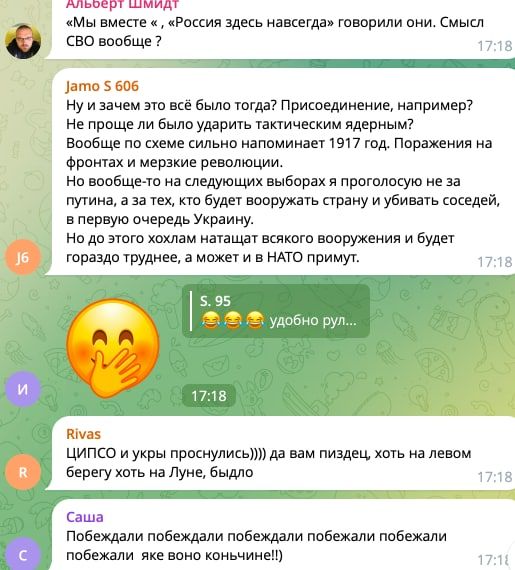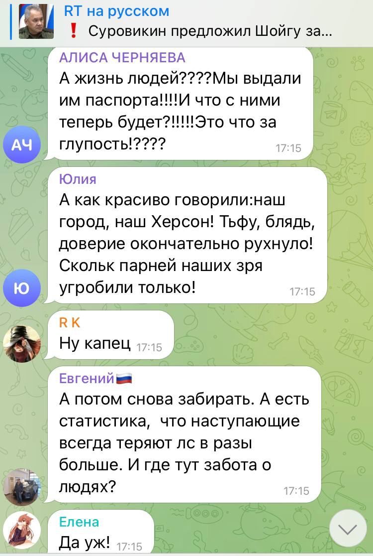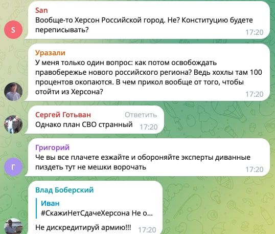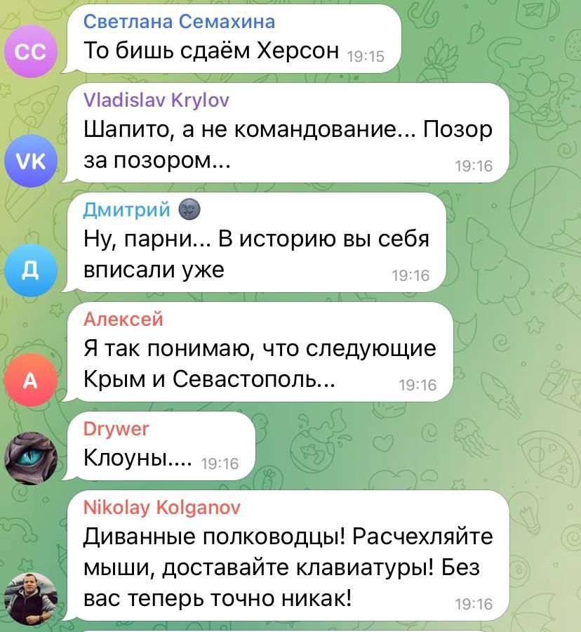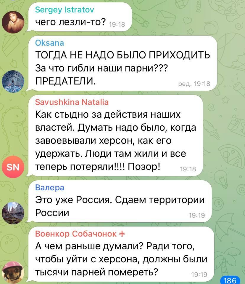 Очевидно, що росіяни вже встигли прокоментувати чергові "вдалі" рішення військового командування своєї країни. В них по-справжньому підгорає, адже їх запевняли, що "Росія в Херсоні назавжди". У різних телеграм-каналах вони критикують такі дії, й обурюються.