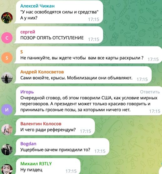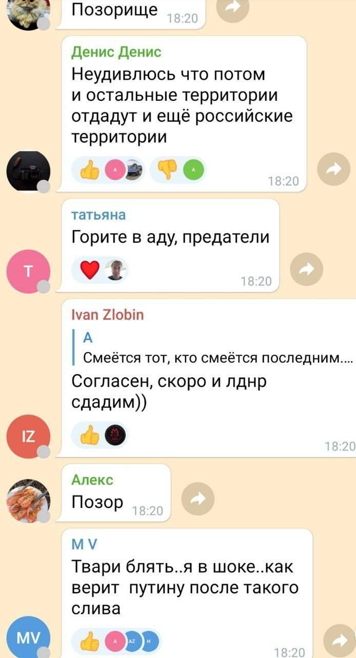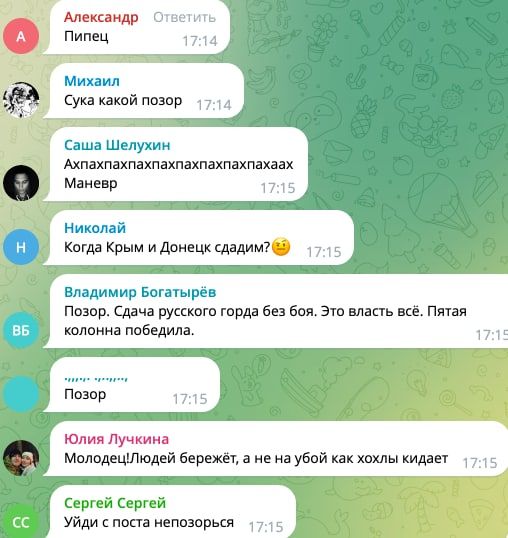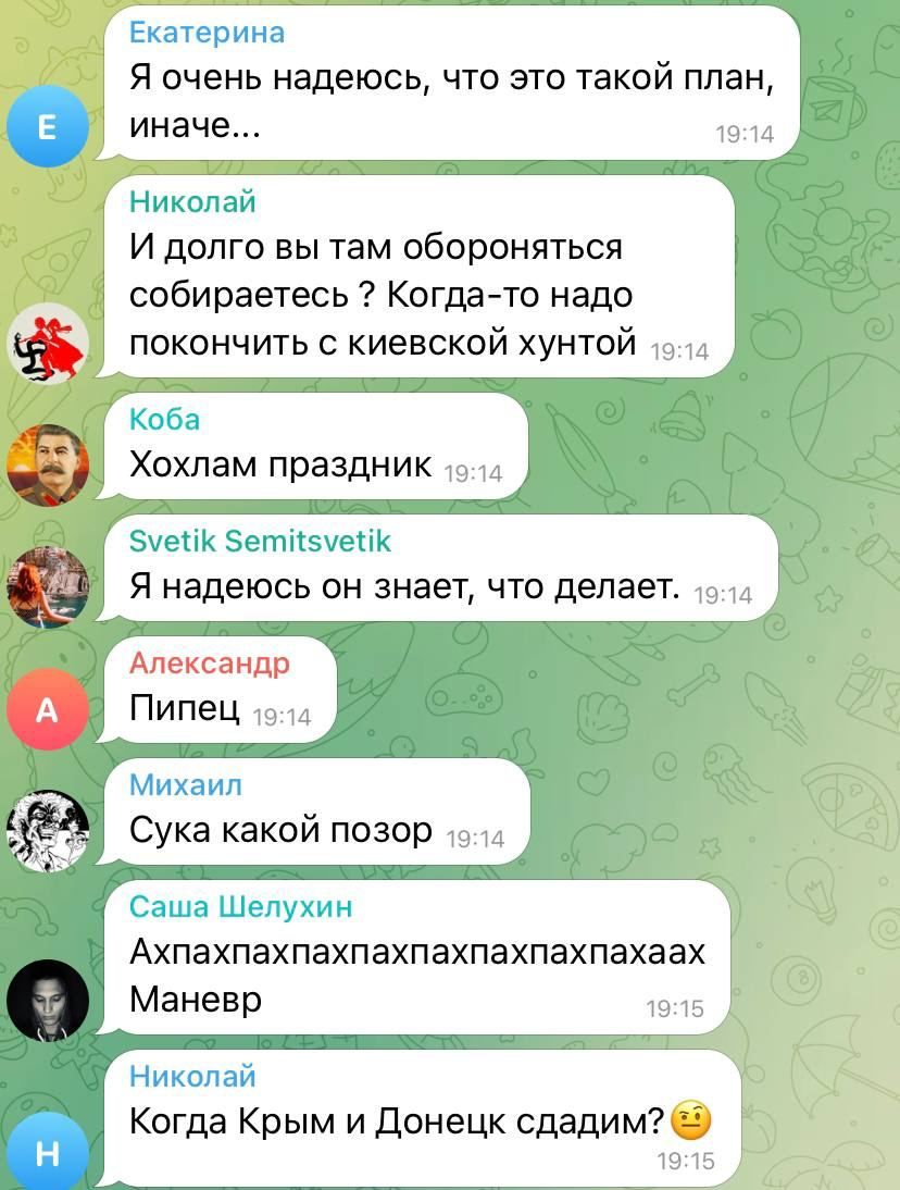 Росіяни шоковані діями командування, дивуються, для чого було тоді взагалі заходити в місто, щоб потім "здати" його. Згадують у коментарях й про свого президента – "як вірити Путіну після такого зливу?".