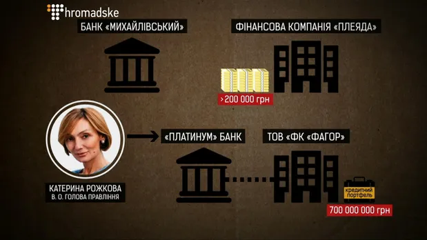 Також це надало можливість залучати кошти клієнтів на рахунки фінансової компанії "Плеяда", яка в подальшому придбала кредитний портфель фізичних осіб банку обсягом майже у 700 мільйонів гривень і вже наступного дня передала іншій компанії — ТОВ "ФК "Фагор", яку пов’язують з "Платинум банком". Де в.о. голови правління свого часу працювала Катерина Рожкова.