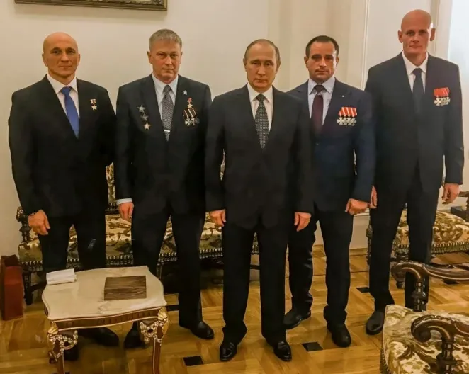 Офіцер ГРУ та командир ПВК "Вагнера" Дмитро Уткін (праворуч), його заступник Андрій Трошев та командири роти Андрій Богатов і Олександр Кузнецов (по праве і ліве плече від бункерного) разом із Путіним / Фото російських пропагандистів