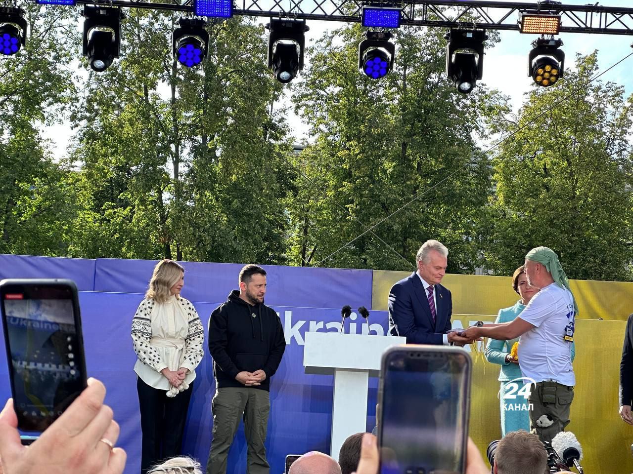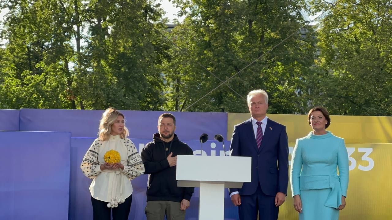 Володимир Зеленський у виступі акцентував, що українські прапори на литовських вулицях однозначно доводять – ми вже союзники. За словами Президента України, синьо-жовтий стяг з Бахмута символізує свободу як України, так і Литви.